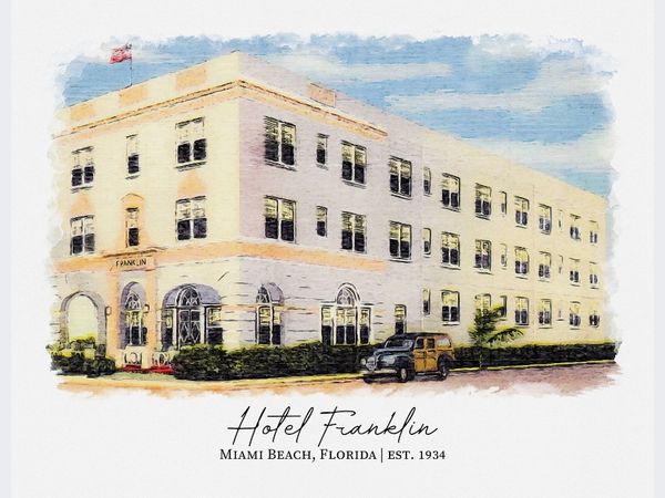 Among these treasures is the Franklin Hotel, built in 1934 by Hungarian-born architect Victor Nellenbogen. The hotel features signature Art Deco motifs of simplified and flattened flowers and leaves on its friezes, typical of the era. It also blends modern and classical elements, with arched windows on the ground floor and a Classically influenced entrance portico, adding timeless elegance. The Franklin Hotel's unique charm and architectural significance make it a standout within Miami Beach's celebrated Art Deco Historic District.